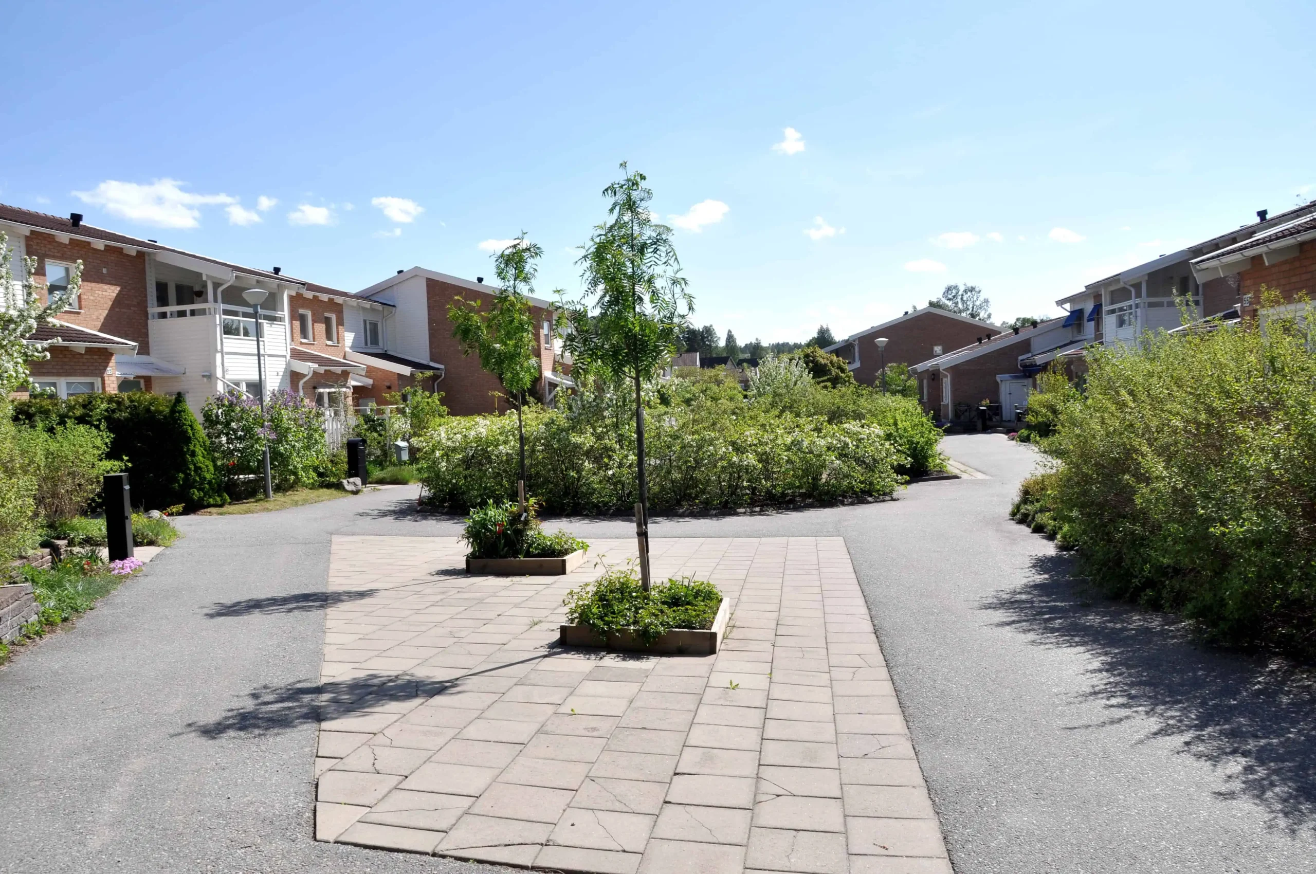 Husen uppfördes av Skanska på en tomt som tidigare varit trädgårdsmästeri. Det finns 6 tvåor, 6 treor, 48 fyror och 6 sexor, d.v.s. totalt 66 lägenheter/hus runt tre gårdar.